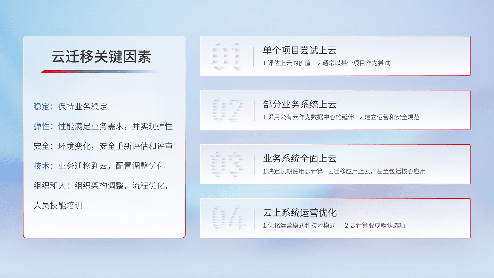 结合实际业务,,,从规划设计、、、、云平台选型、、、、云原生改造、、、、数据迁移、、、、集成交付,,,迁移全过程为客户识别最佳上云路径,,,做好风险识别管理,,设计网络架构、、身份权限、、安全审计合规、、、操作审计、、、日志审计、、、监控告警策略、、、、多站点容灾设计等,,,,对云上基础设施进行整体规划,,提升IT治理水平,,以满足弹性、、、高可用、、、、高性能的需求。。。