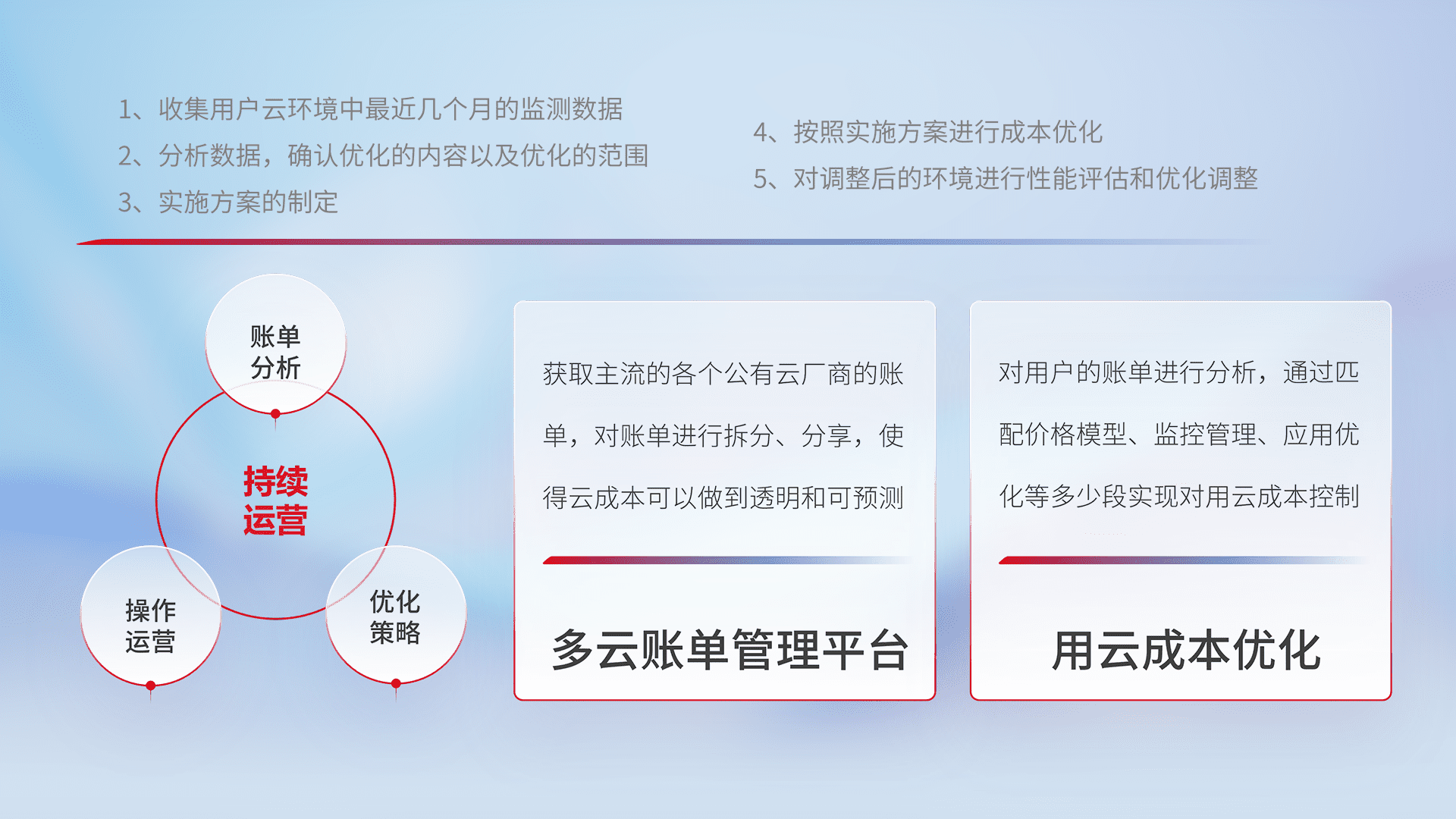 通过多云纳管,,以统一的资源数据模型把客户的云资源进行抽象和封装,,,进而实现对多云资源的统一操作,,,保障云资源管理的可靠性、、稳定性与可用性。。量身定制化运维内容,,,配置、、开发运维、、、、补丁管理、、、、备份、、、、监控、、、认证和访问管理、、审计和日常巡检等,,保障在用云过程中的可靠度,,,稳定度以及高可用率。。